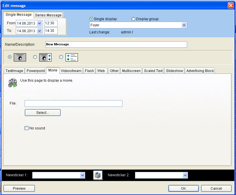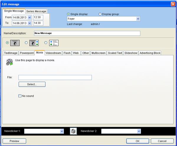 Go back to the menu “change” and select the flag “Video”. By clicking “select” a video file can be selected. It is required to save it under C:/VICOMVisGuide/Media.