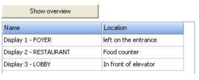 The display view is located underneath the calendar. All displays are shown here. They are named and the location is marked. The configuration of the displays with the required integration into the VisGuide architecture has to be realised by a technician. By clicking the button “Show overview” all displays for the current day are shown on the right hand side. By clicking on the indiuvidual display, the weekly overview for it is shown on the right hand side.