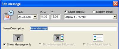 The display on the large display monitors can be lodged individually. Enter the module Info-Displays by pressing the appropriate button on the lower left side and double-click the message box on the screen, so the “Edit message” window will show up.