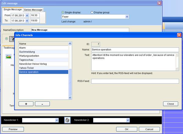 In the window “edit message” you will find at the bottom two choice boxes “news ticker 1” and “news ticker 2”. To create a new news ticker message, click with your mouse on the button between the two boxes. The window “info channels” will open. Click on the plus button with your mouse and fill-in the name and text in the appropriate boxes.