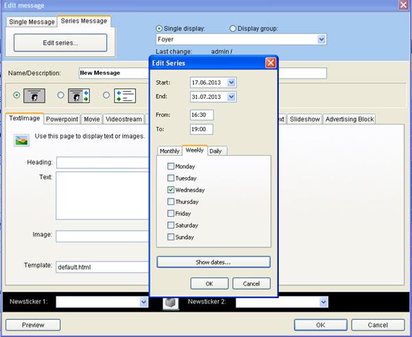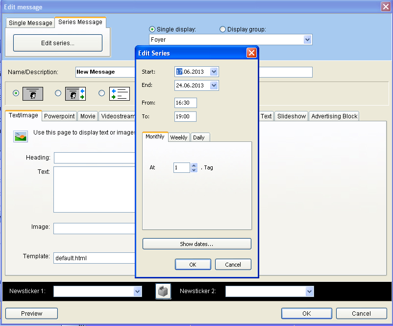 Apart from single messages there are also repeat messages. Here, you can determine at which interval the message should be repeated. Within a certain period of time messages can be repeated daily, weekly or monthly.