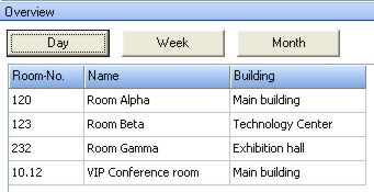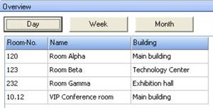 Below the calendar you will find the conference room overall view. The available conference rooms will be described with a room number and a brief description of its locality. Within this list you can choose single rooms with the left mouse button.