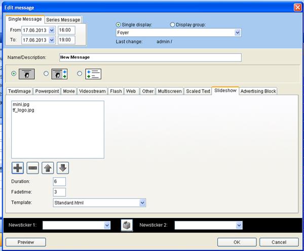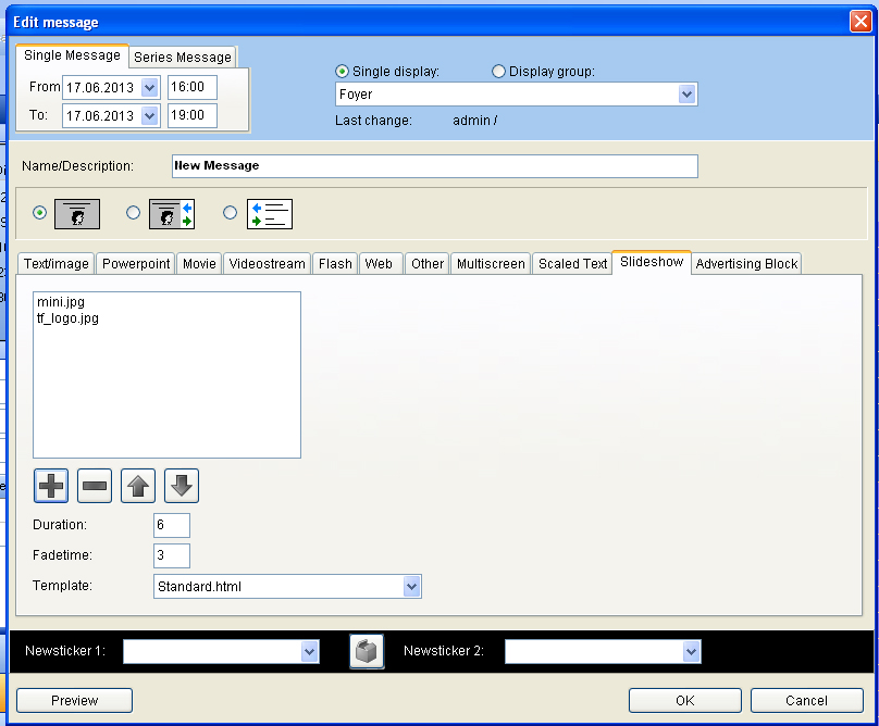 Pictures which were saved in the index c:/VICOMVisGuide/Media can be played as a slide show. Choose the flag “slide show” in the window “edit message”. You can add a picture with the “plus button” and delete it with the “minus button”. By using the arrow buttons you can alter the sequence of the pictures. In the box “length” you can determine how many seconds you want the picture to be shown and in the box “cross fading” you determine the length of time until the next picture will be shown.