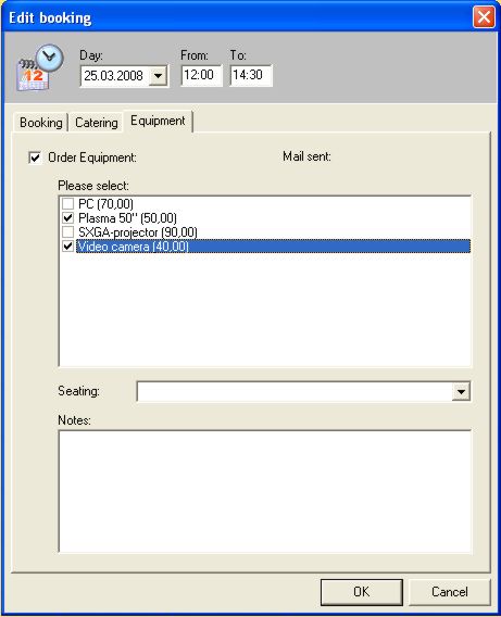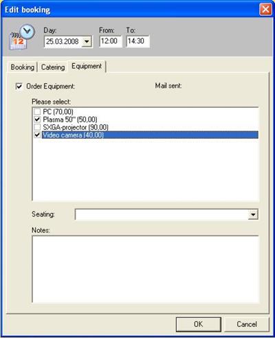 In equipment the operator can order individual technique for the room in question. When clicking on the file, a selection will be offered. Next to each technical article, which can be ordered, you will find the renting price per day. In seating different ways of seating arrangements can be chosen, for example parliamentary, horseshoe, diamond and so on. In notes further individual comments for the technical department can be noted, i.e. “Please send a technician at 12.30 h to connect technical equipment of a customer.”