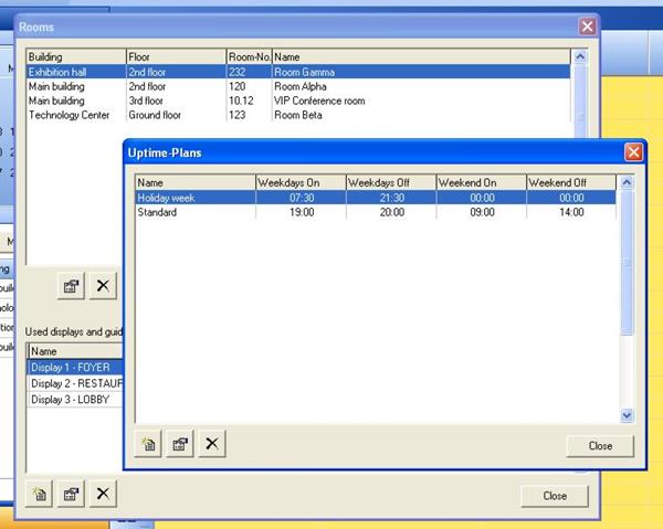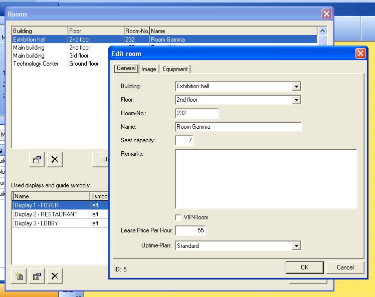 Menu “Edit” -> “edit displays…”. With double-click on the desired room the new dialog will open up. In this window allows to enter name, location, seat capacity, remarks, lease price per hour and to select an uptime plan, which is already existing.
